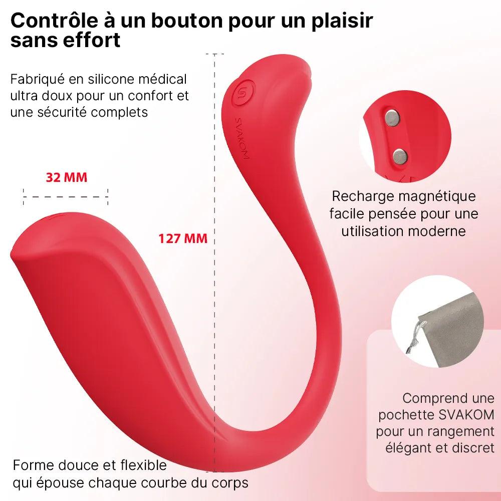 Équipé de 11 modes de vibration, d’une autonomie d’environ 4 h30 après 2 h de charge et d’une connexion Bluetooth via l’application SVAKOM (et Koosync) pour le contrôle à distance, la personnalisation ou l’interaction avec des vidéos pour adultes/webcam, il transforme chaque instant intime en moment d’exception.